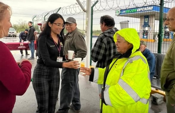 Matamoros, Tamaulipas.-En una mañana marcada por las lluvias y durante la entrega correspondiente a las letras “P” y “Q”, personal de la Secretaría de Bienestar Social, llevó café caliente a las personas adultas mayores que acudieron a realizar sus trámites en las sucursales del Banco del Bienestar Sexta, Villa Madrid y Ejido Galaneño.