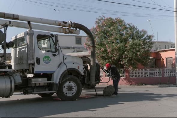 Matamoros, Tamaulipas.-El camión vactor de la Junta de Aguas y Drenajes, realizó trabajos de limpieza y desazolve en las líneas de drenaje de la colonia Delicias, como parte de las acciones permanentes para mejorar el funcionamiento de la infraestructura sanitaria.