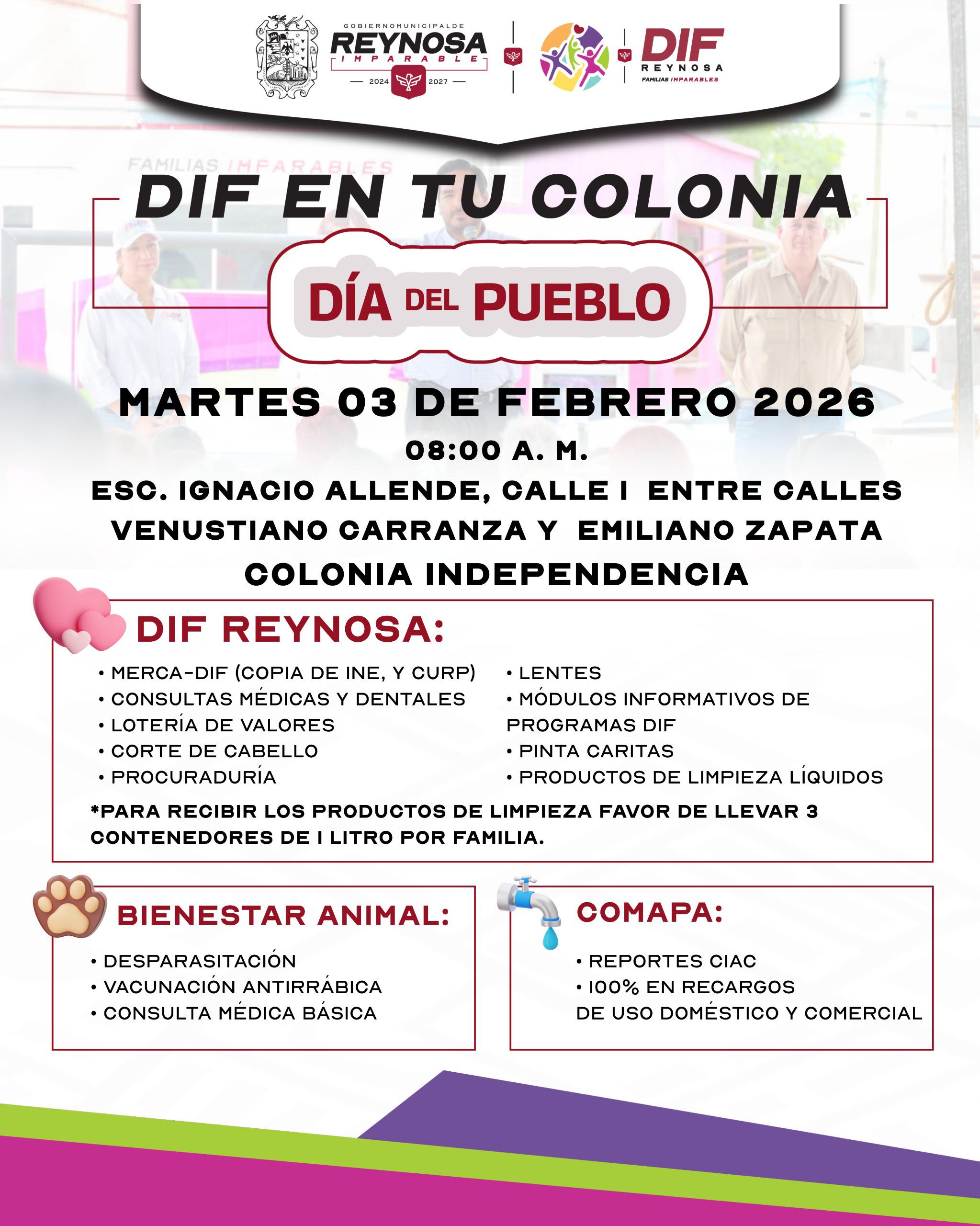 El Sistema DIF-Reynosa que encabeza Carlos Luis Peña Garza, realizará la Brigada”DIF en Tu Colonia”, el martes 03 de febrero, a partir de las 08:00 de la mañana, en la Escuela “Ignacio Allende”, ubicada en la calle I, entre Venustiano Carranza y Emiliano Zapata, en la colonia Independencia, con el objetivo de acercar servicios y apoyos a las familias del sector.