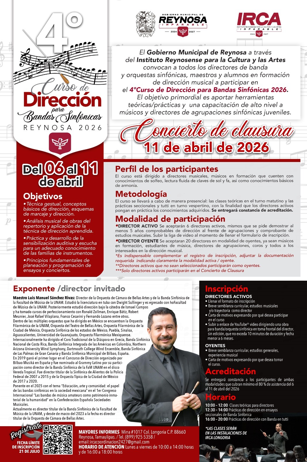 A fin de fortalecer la excelencia artística y el desarrollo de las agrupaciones musicales en nuestra región, el Gobierno de Reynosa, que preside el Alcalde Carlos Peña Ortiz, invita a directores de bandas y orquestas, Maestros y estudiantes de dirección a participar en el 4o Curso de Dirección para Bandas Sinfónicas 2026.