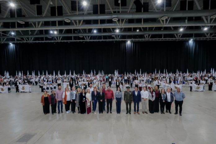 Tampico, Tamaulipas.-Con el propósito de fortalecer la identidad cívica, los valores y el sentido de pertenencia en la comunidad educativa, la Presidenta Municipal de Tampico, Mónica Villarreal Anaya, encabezó la Ceremonia de Entrega de 151 lienzos del Escudo de Armas de Tamaulipas a igual número de planteles públicos de educación básica y media superior, en un evento realizado en las instalaciones de Expo Tampico.