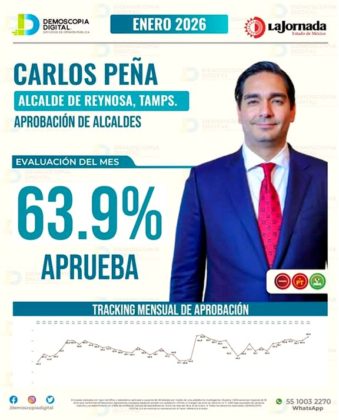 Reynosa, Tamaulipas.-De acuerdo con mediciones demoscópicas publicadas en fuentes locales y regionales durante enero y febrero de 2026, el presidente municipal de Reynosa, Carlos Peña Ortiz, registra niveles significativos de respaldo ciudadano.