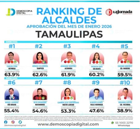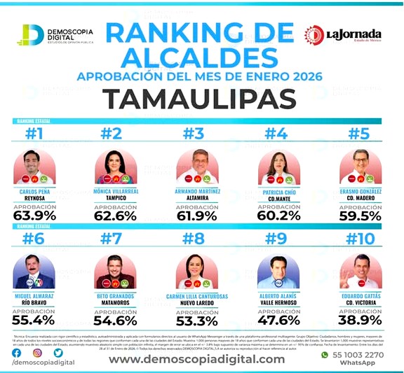 Una encuesta de la firma Demoscopía Digital correspondiente al mes de enero de 2026 reporta un 63.9% de aprobación a su gestión, lo que lo posiciona en el primer lugar del ranking de alcaldes en el estado de Tamaulipas.