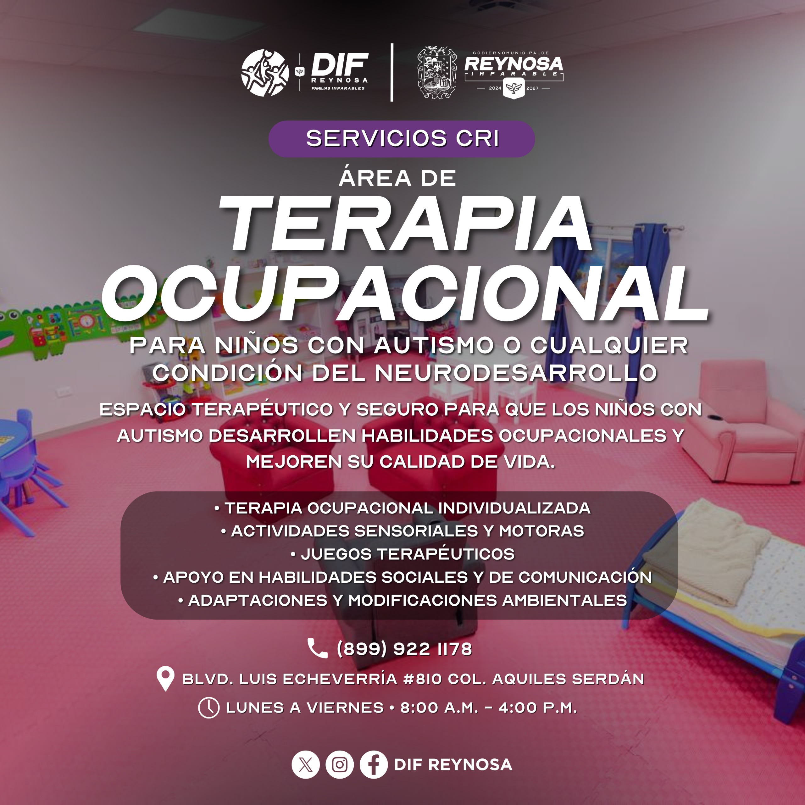 Con el objetivo de fortalecer habilidades esenciales para su vida diaria, el Sistema DIF-Reynosa que preside Carlos Luis Peña Garza, cuenta con el área de Terapia Ocupacional en el Centro de Rehabilitación Integral, un espacio orientado a apoyar a niñas y niños dentro del Trastorno del Espectro Autista, y con alguna condición del neurodesarrollo.