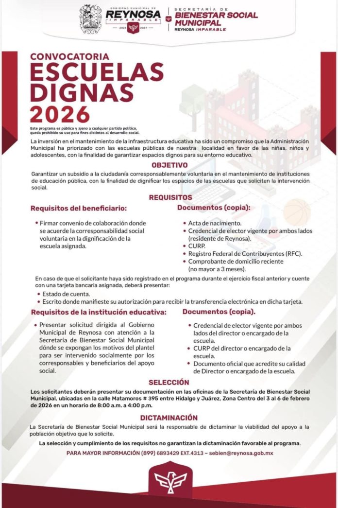 El Alcalde Carlos Peña Ortiz, lanzó a través de la Secretaría de Bienestar Social, la Convocatoria del programa “Escuelas Dignas 2026”, una iniciativa que busca mejorar la calidad de la educación en Reynosa mediante el mantenimiento de las instituciones públicas, garantizando espacios dignos para el entorno educativo de niños, niñas y adolescentes.