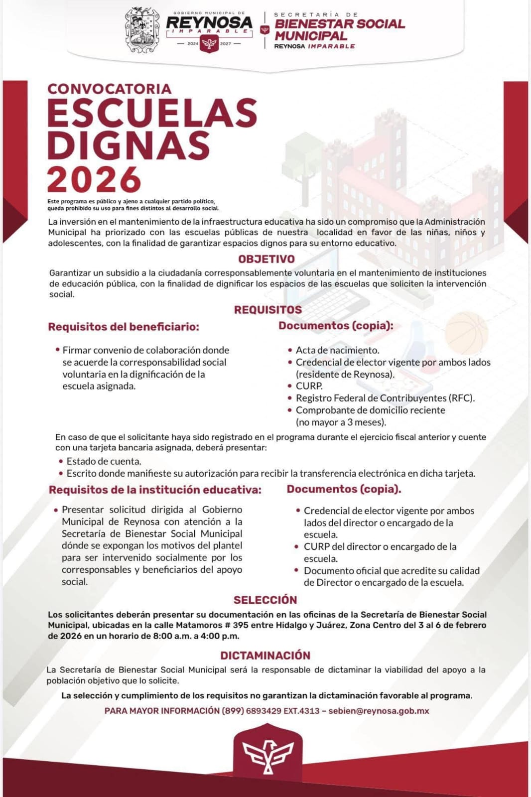 Recepción de documentos de las instituciones educativas en: Secretaría de Bienestar Social Municipal. Consulte fechas y requisitos en la convocatoria o pida más información al teléfono 8996893429 Extensión 4313; puede solicitarla también por correo electrónico: [email protected]