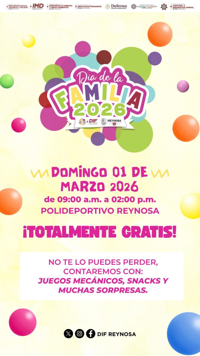 En el marco de las celebraciones por el Aniversario de la Fundación de la ciudad, el Alcalde, Carlos Peña Ortiz, a través del Sistema DIF-Reynosa que preside Carlos Luis Peña Garza, invita a las familias a participar en el Día de la Familia, un evento diseñado para fortalecer la convivencia y promover los valores familiares en un ambiente sano y recreativo.