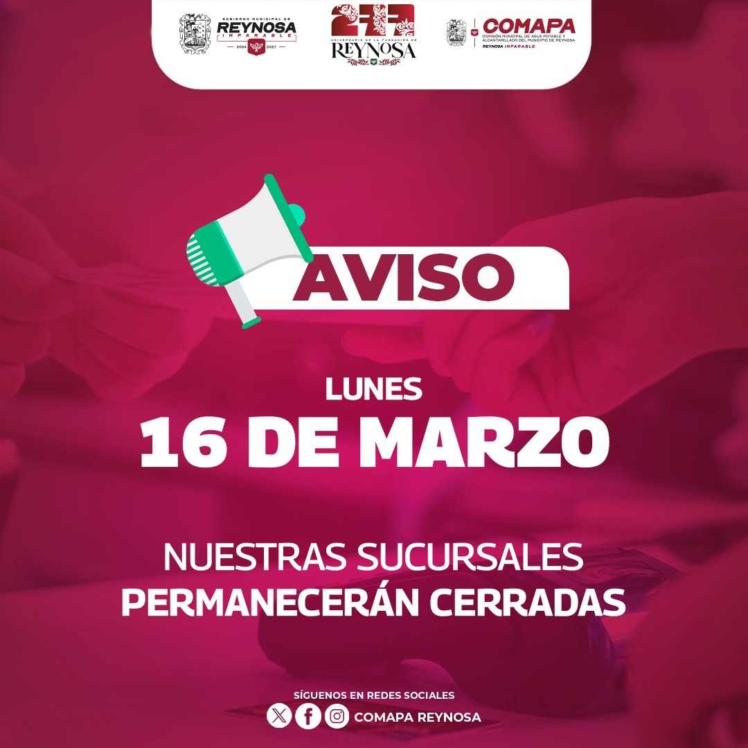 La Comisión Municipal de Agua Potable y Alcantarillado de Reynosa informa a los usuarios que este lunes 16 de marzo todas las sucursales y cajas de atención permanecerán cerradas, con motivo de la conmemoración del natalicio de Benito Juárez.