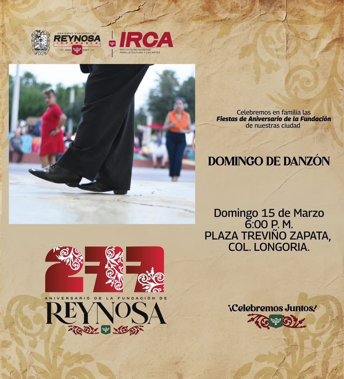El Presidente Municipal Carlos Peña Ortiz invita a la población de la región a disfrutar del arte y la cultura en la conmemoración del 277 Aniversario de la Fundación de Reynosa, en las plazas Miguel Hidalgo y Treviño Zapata, hoy domingo 15 de marzo.