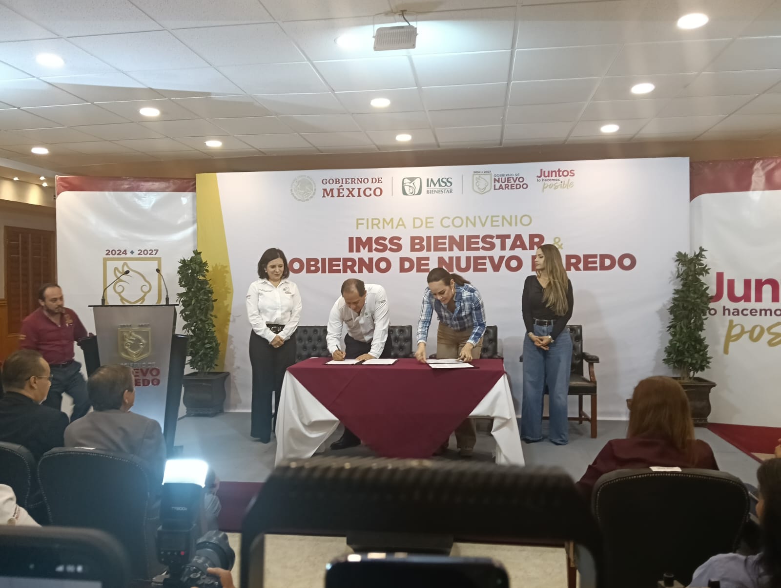 Nuevo Laredo, Tamaulipas.- Un convenio de colaboración entre el Imss/Bienestar y el municipio fue firmado este día por el coordinador estatal de dicho organismo, Martín Antonio Rodríguez Avendaño y la alcaldesa Carmen Lilia Cantúrosas, con la finalidad de garantizar el acceso a unos servicios de salud, gratuitos, dignos, oportunos y de calidad para cerca de 100 mil personas que no cuentan con ningún tipo de seguridad social en esta ciudad.