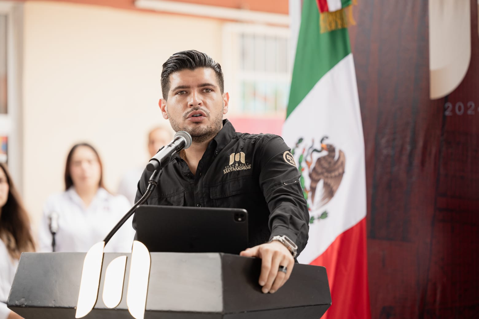 Matamoros, Tamaulipas.-Comprometido con la educación y el fortalecimiento de la identidad nacional, el alcalde Beto Granados encabezó la ceremonia de honores a la bandera en el Jardín de Niños “Valentín Contreras”, donde reafirmó su apoyo para mejorar las condiciones de aprendizaje de la niñez matamorense.