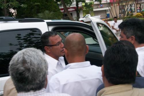 Y ante la negativa del mismo, por un lapso de 15 minutos no pudo bajar de la unidad blindada a fin deque no fuera por los ambulantes quienes ya estaban con los ánimos caldeados y enardecidos; posteriormente el personal de seguridad tras haber perdido el control escoltando a la primera autoridad, tuvieron que ser apoyados inclusive por algunos regidores, en el caso de José Luis Martínez Navarro, Gerardo Grajales, Ana Martínez, el secretario técnico Elías Ahuet entre otros empleados del municipio quienes se encargaron de hacer una valla y sacar entre empujones y jaloneos a los ambulantes para que dejaran salir al alcalde, que finalmente salió a bordo de su unidad a gran velocidad.