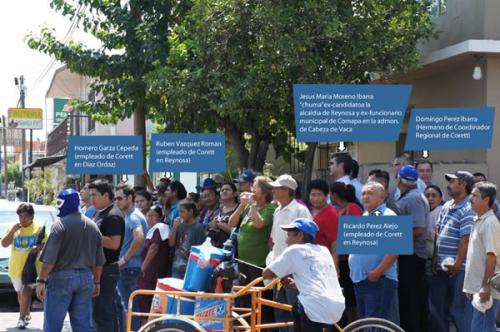 “Chuma” Moreno aparece al lado de la ex –regidora del PAN, Teresa Alejo, y detrás suyo se ubica a Domingo Pérez Ibarra (ex jefe del programa de pipas de abasto de agua en Comapa), y hermano del ex candidato a diputado local, Héctor Pérez Ibarra (actual coordinador regional de Corett).